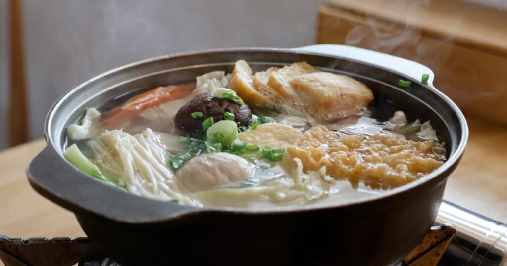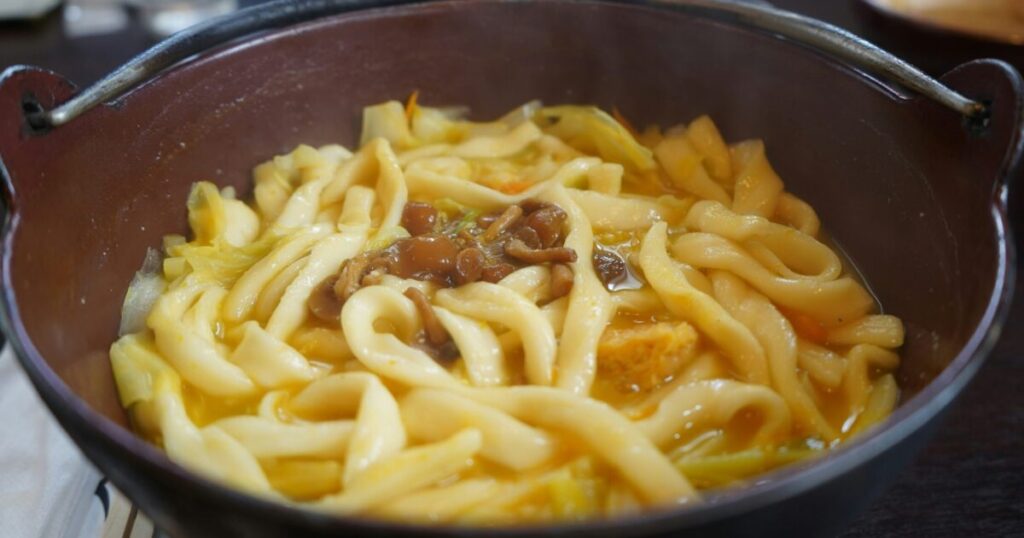 Another dish I make regularly in winter is houtou (ほうとう) — a specialty from Yamanashi prefecture that isn’t as well known nationally as nabe but is deeply comforting in its own way. It’s a thick, flat udon-like noodle simmered in a rich miso-based soup with kabocha (かぼちゃ) pumpkin, root vegetables, and often pork or chicken. The kabocha practically melts into the broth and gives it a natural sweetness. It’s the kind of dish that makes you feel warm from the inside out.